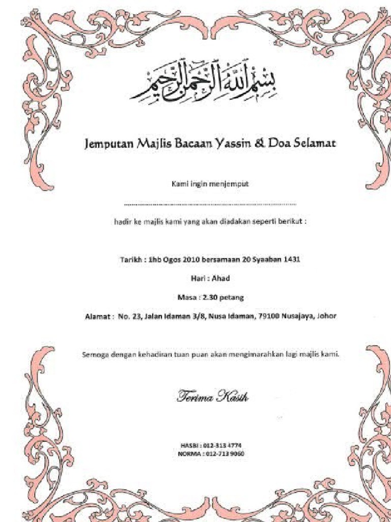 Jemputan Majlis Bacaan Yassin Dan Tahlil Bulanan February 27 2019. Kad Majlis Kesyukuran Dan Doa Selamat. KENDURI KESYUKURAN Muhammad Razif Bin Dahalan Nurul Fazilah Binti Abdul Manab Dengan segala hormatnya kami mempersilakan TuanPuanEncikCik.